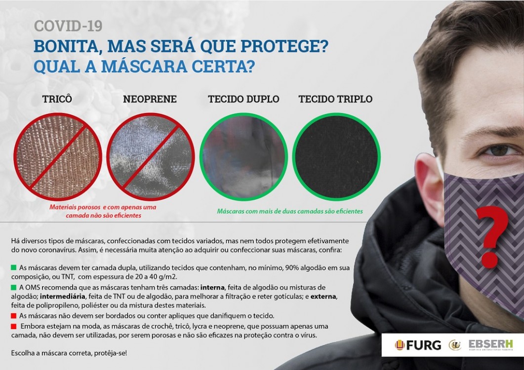 Há diversos tipos de máscaras, confeccionadas com tecidos variados, mas nem todos protegem efetivamente do novo coronavírus. Assim, é necessária muita atenção ao adquirir ou confeccionar suas máscaras. Elas devem ter camada dupla, utilizando tecidos que contenham, no mínimo, 90% algodão em sua composição, ou TNT, com espessura de 20 a 40 g/m2.