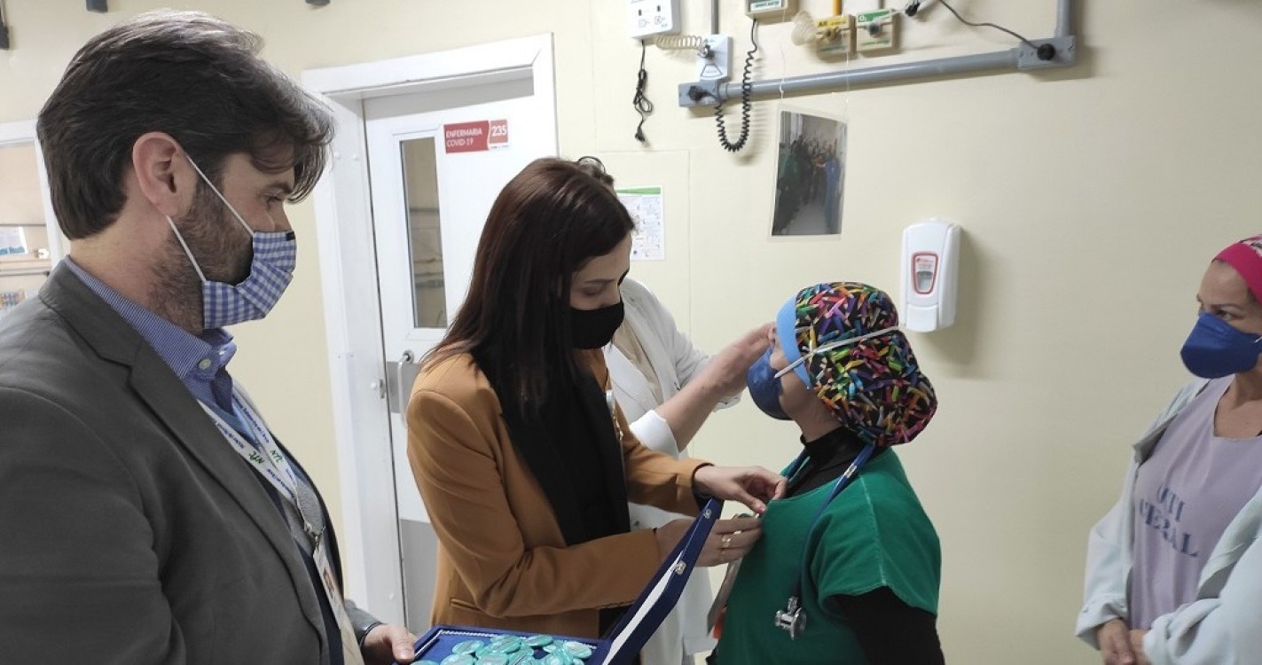 O encerramento da Enfermaria Covid-19 foi marcado por muita emoção, durante a homenagem realizada pela Governança do Hospital aos colaboradores que atuaram na Unidade. Na ocasião, a superintendente do HU-Furg, Sandra Brandão, o gerente de Atenção à Saúde, Fábio Lopes, e a chefe da Divisão de Enfermagem, Carmem Rivoire, agradeceram a todos que trabalharam no atendimento aos pacientes com Covid-19. Na ocasião, foi entregue boton com a frase: “Trabalhador da Saúde – Nós admiramos você”. O evento, também, contou com alguns pacientes recuperados que foram atendidos na Unidade.