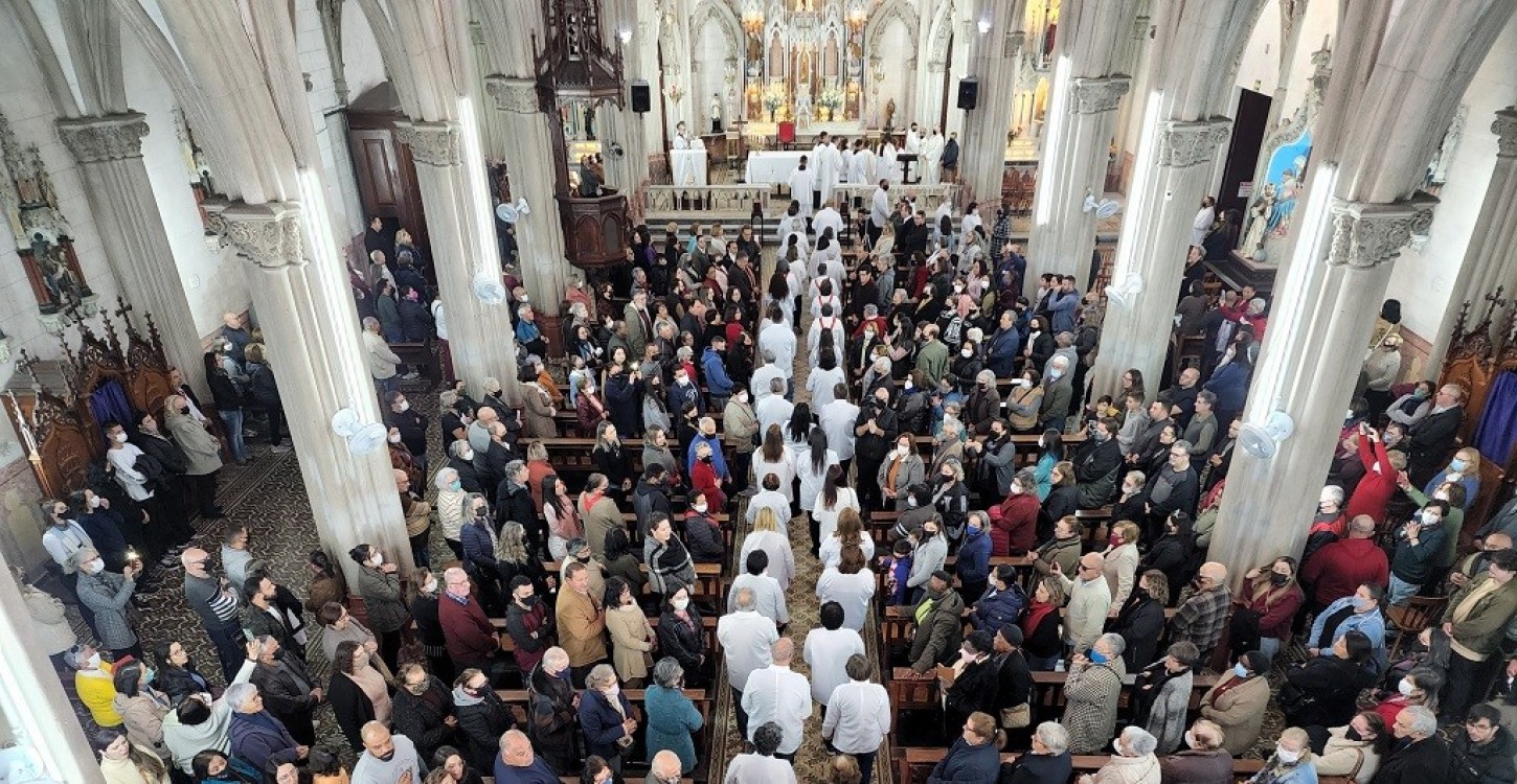 A grande expectativa, após dois anos de espera, foi traduzida pelo número significativo de pessoas que acompanharam a missa realizada na igreja Nossa Senhora do Carmo. Celebrada pelo bispo da Diocese do Rio Grande, Dom Ricardo Hoepers, ela contou com a participação de sacerdotes de todas as comunidades católicas do município. Do lado de fora, mais pessoas aguardavam a saída da caminhada de fé.
