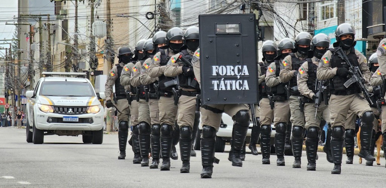 A Brigada Militar iniciou as comemorações com o desfile das tropas atuantes no policiamento ostensivo, viaturas e integrantes de programas como o Proerd. Fotos: Rodrigo de Aguiar/Papareia News