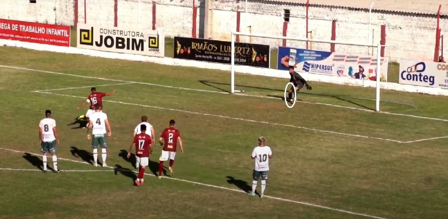 Diferentemente do que sinalizou a arbitragem, o goleiro Júlio César tinha um dos pés sobre a linha do gol no momento da primeira cobrança do Inter-SM. Foto: Frame de vídeo/FGFTV