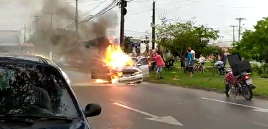 Uma ambulância do Serviço Municipal de Urgência (SMU), mantido pela Secretaria Municipal de Saúde (SMS), estava passando no momento em que as chamas começaram a realizou o atendimento do condutor e dos outros dois passageiros, que não sofreram ferimentos. Foto: Divulgação/Redes sociais