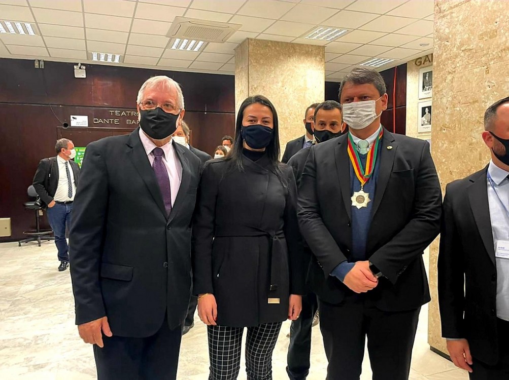 A presidente da CDL Rio Grande e São José do Norte, Letícia Vanzelote, esteve nesta sexta-feira (9), no Teatro Dante Barone da Assembleia Legislativa. Logo após o evento de outorga da Medalha Mérito Farroupilha ao Ministro de Estado da Infraestrutura, Tarcísio Gomes de Freitas, a CDL realizou a entrega de um documento com a principal demanda da entidade ao Ministro: a conclusão do estudo de Viabilidade da ponte entre Rio Grande e São José do Norte e sua inclusão na lista de prioridades do Governo Federal. Esteve presente também na entrega o coordenador da Comissão Regional Pró-Ponte Rio Grande / São José do Norte, Jair Rizzo.
