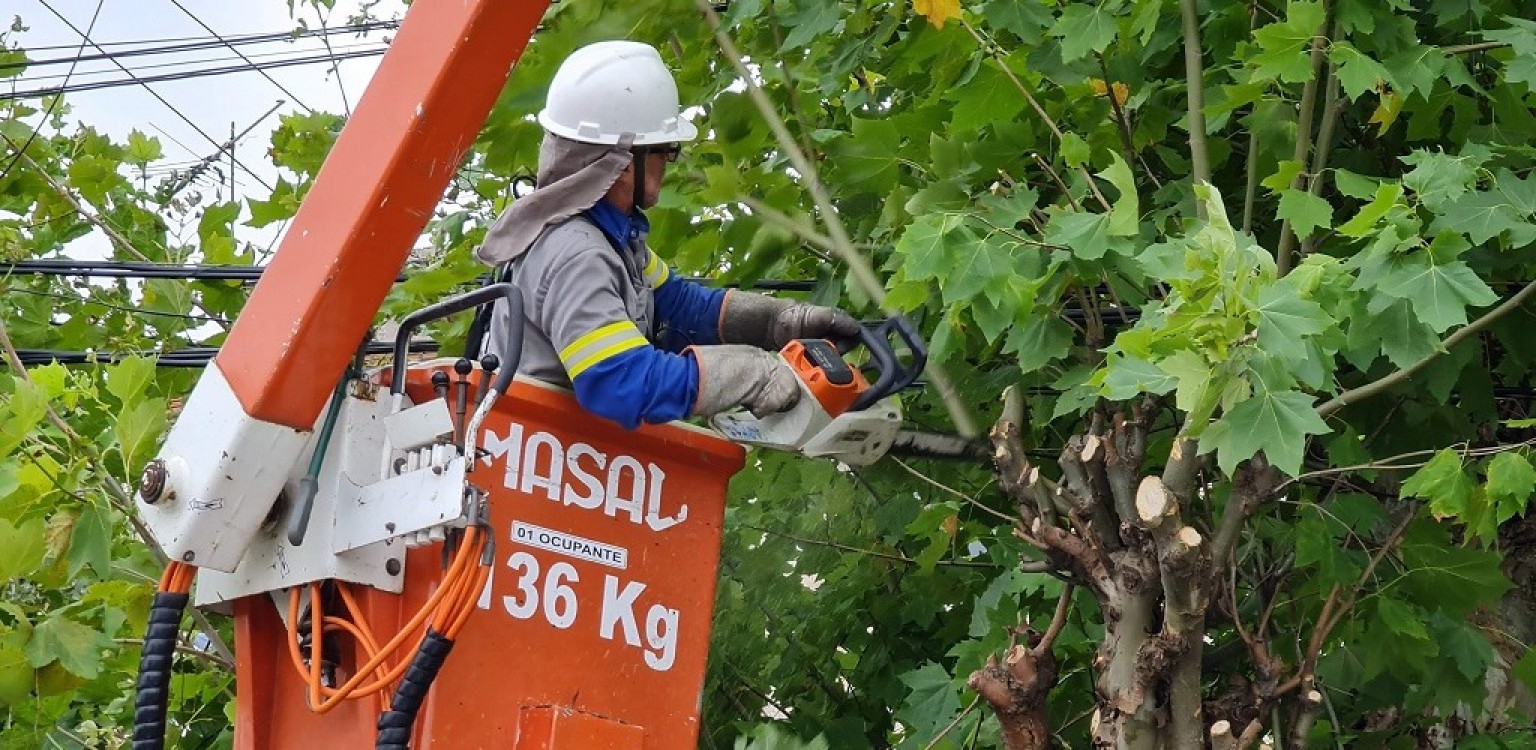 Na Rua Padre Feijó, no trecho entre a Avenida Portugal até a Lagoa dos Patos, um plátano acabou caindo sobre a linha de transmissão, atingindo as redes de média tensão, o equivalente a 13 mil volts, e a baixa tensão, onde ocorrem as ramificações de 110 e 220 volts. A Companhia trabalhava no local com dois caminhões para fazer o corte dos galhos e a substituição dos fios.