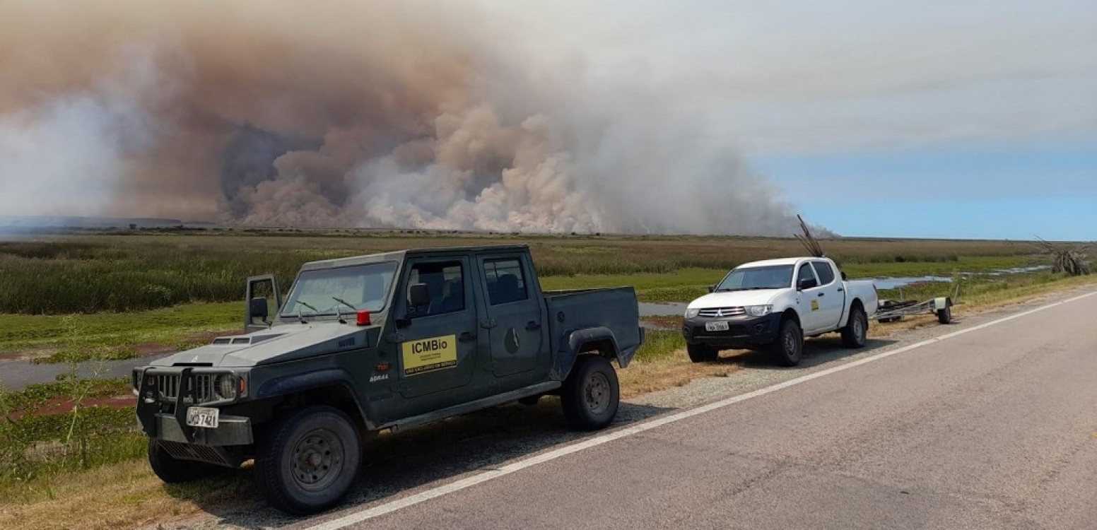O incêndio que atinge uma extensa área de vegetação na Estação Ecológica do Taim chegou nesta quinta-feira (15) ao seu quarto dia. Desde a última segunda-feira (12), brigadistas do Instituto Chico Mendes de Conservação da Biodiversidade (ICMBio) e da empresa CMPC trabalham para conter o avanço das chamas.