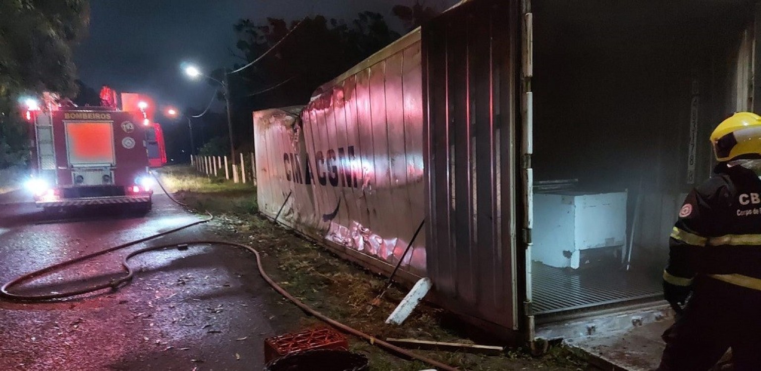Segundo os bombeiros, o contêiner, que possuía freezers em seu interior, estava localizado em um pátio e a ocorrência não levou perigo para o entorno. Foto: Divulgação/Redes sociais