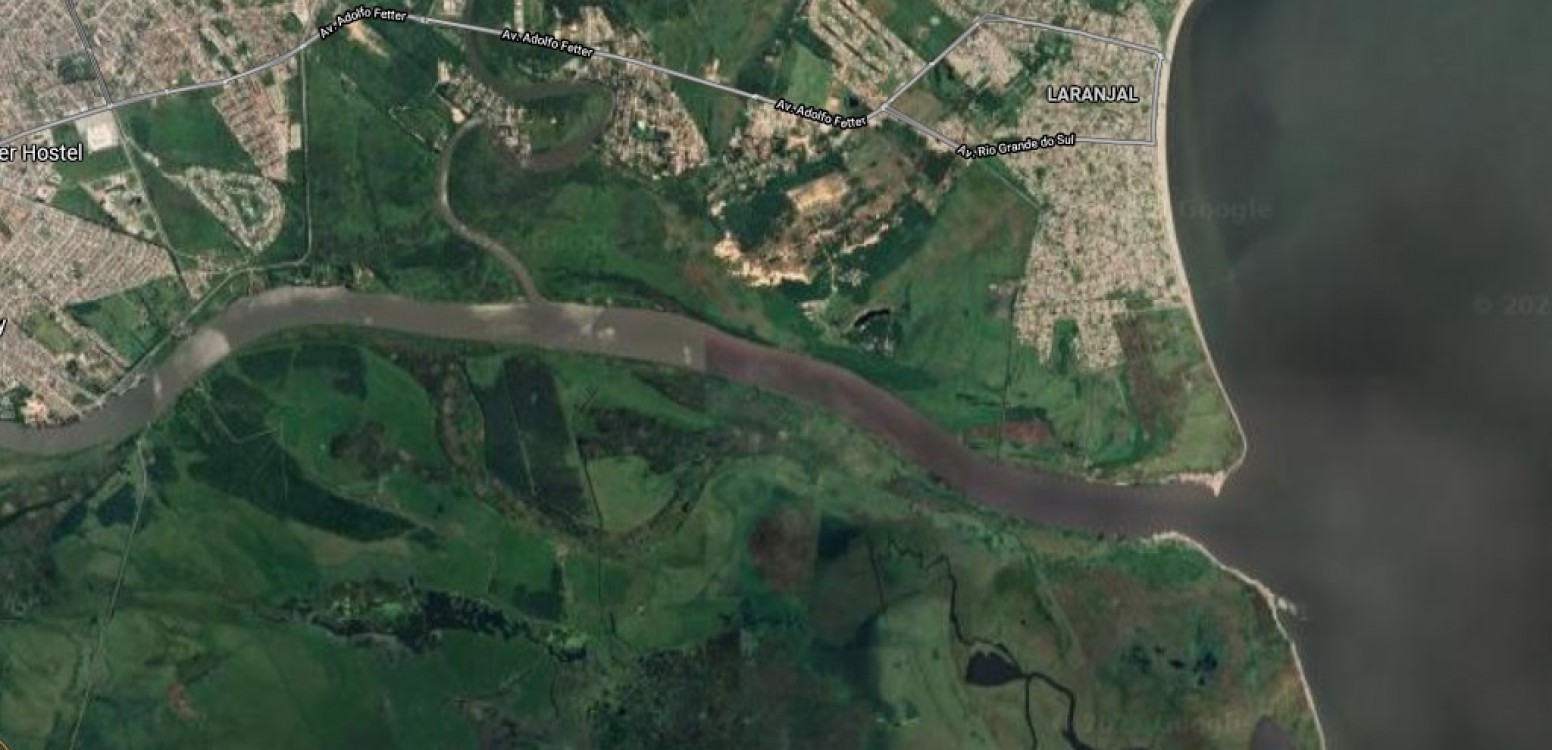 Do Clube de Caça e Pesca da cidade, os bombeiros seguiram por cerca de 30 minutos em direção à Lagoa dos Patos, margeando o canal e realizando buscas superficiais até que localizaram o corpo preso aos juncos. Foto: Divulgação/Google Maps