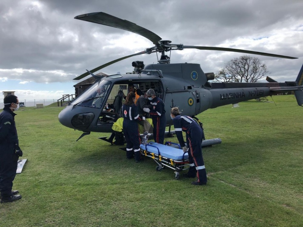 Um pescador foi resgatado, na manhã deste domingo, pelos militares do 1º Esquadrão de Helicópteros de Emprego Geral do Sul (HU-51) da Marinha do Brasil. O tripulante, que estava a bordo da embarcação Dom Isaac XVII, sofreu um ferimento de faca e precisou receber atendimento médico no hospital.