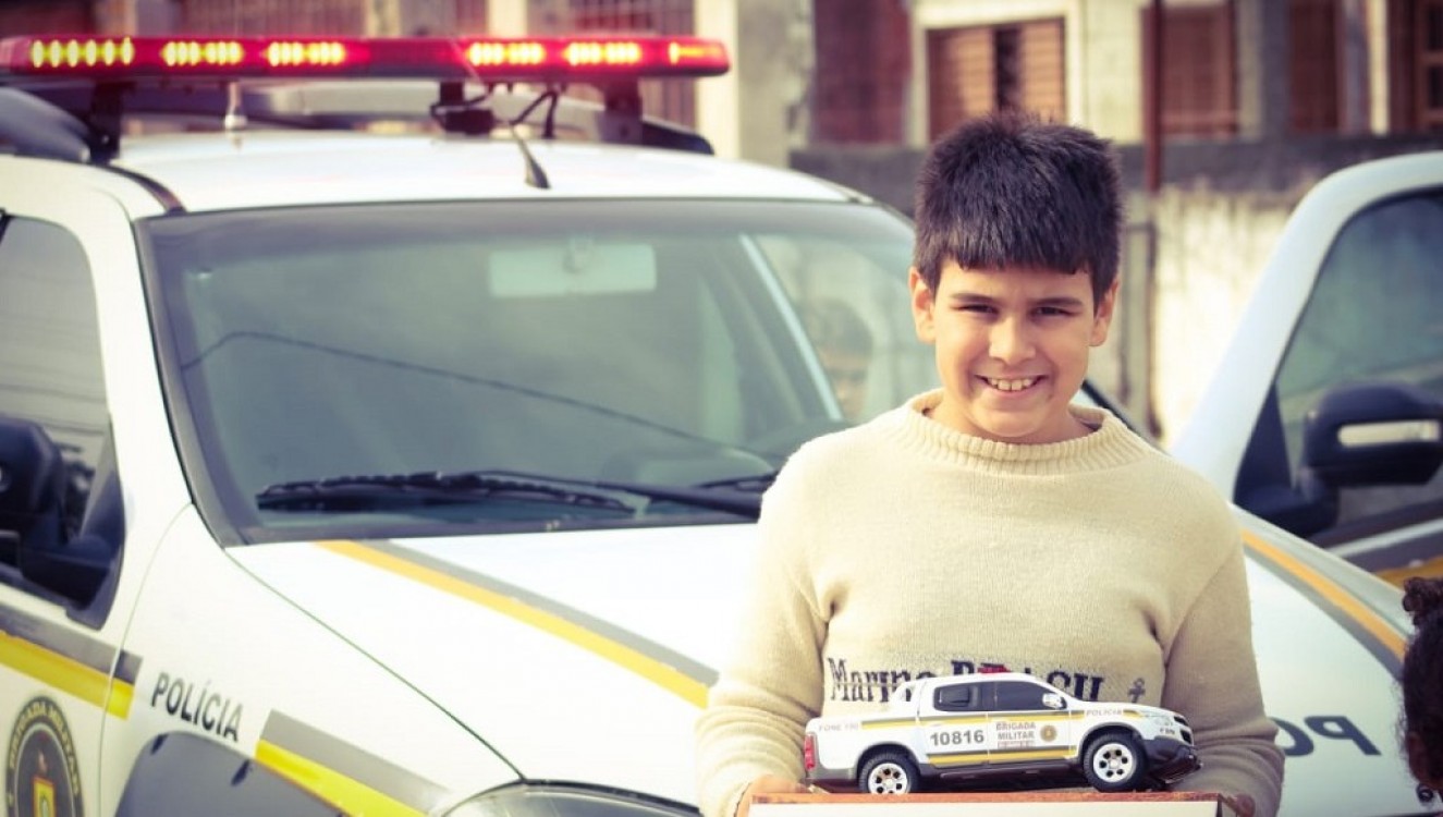Sensibilizados com a situação, colegas do servidor no batalhão organizaram uma surpresa para a criança. A bordo de viaturas da própria Força Tática, eles foram até a casa da família e o presentearam com uma miniatura personalizada da Brigada Militar. Orgulhoso da atividade que fora desempenhada pelo pai, ele abriu a embalagem encantado e curioso.