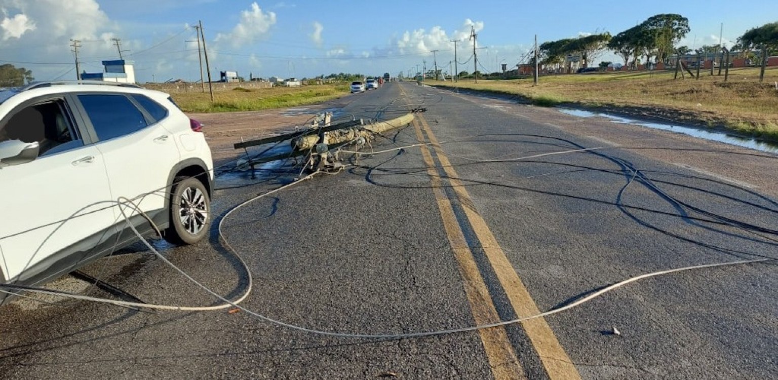Os ocupantes de um veículo levaram um susto, no final da tarde deste sábado (4), durante o temporal de vento que atingiu a cidade do Rio Grande. Um poste de energia elétrica feito em madeira foi arrancado pela força das rajadas e os fios sustentados por ele caíram em volta do automóvel que ficou parado em meio aos cabos.