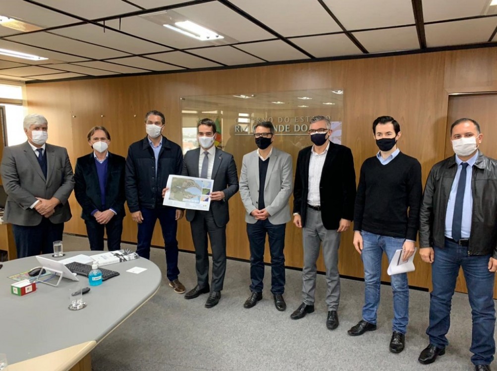 O governador Eduardo Leite e o secretário estadual de Logística e Transportes, Juvir Costella, apresentaram nesta segunda-feira (7), durante reunião com a presença do prefeito Fábio Branco, o novo projeto de duplicação da ERS-734. O principal diferencial em relação ao antigo plano é a previsão de obras entre o trevo e o pórtico — o anterior contemplava a duplicação apenas até a Junção.