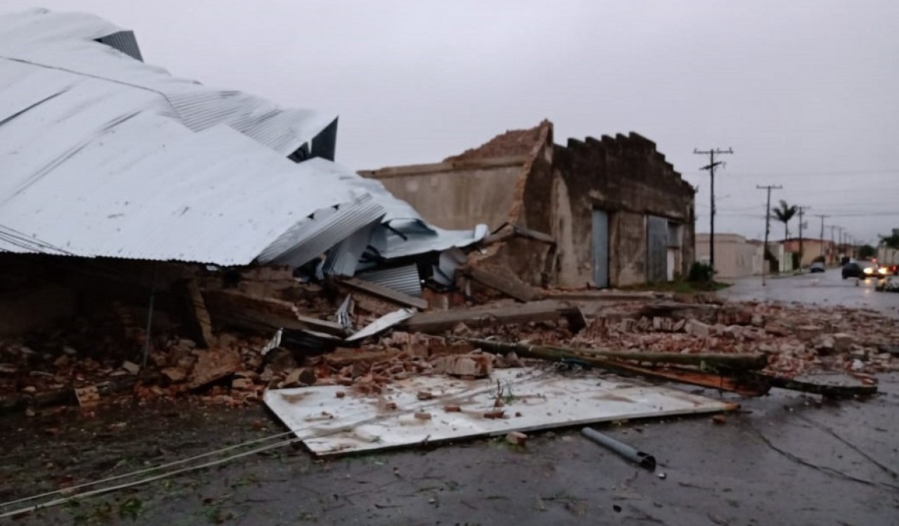 A estrutura de um galpão utilizado para estoque de grãos, localizada na Rua Augusto Leivas, na zona central, acabou não resistindo a força do vento e desabou. A Defesa Civil e o Corpo de Bombeiros tabralham na distribuição de lonas aos moradores que tiveram as residências destelhadas ou perfuradas pelas pedras.