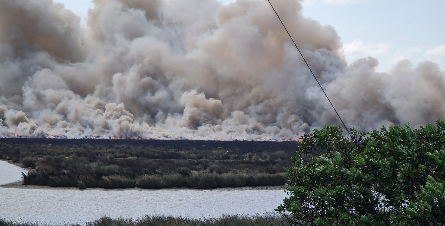 Um incêndio, de proporções significativas, atinge uma área de vegetação próxima da BR 392, na altura do km 15, na tarde desta quinta-feira (29), em Rio Grande. As chamas estão concentradas em uma região de banhado, mas em razão do vento a fumaça acaba sendo jogada na direção da ERS 734, rodovia que liga o Centro da cidade ao balneário Cassino.