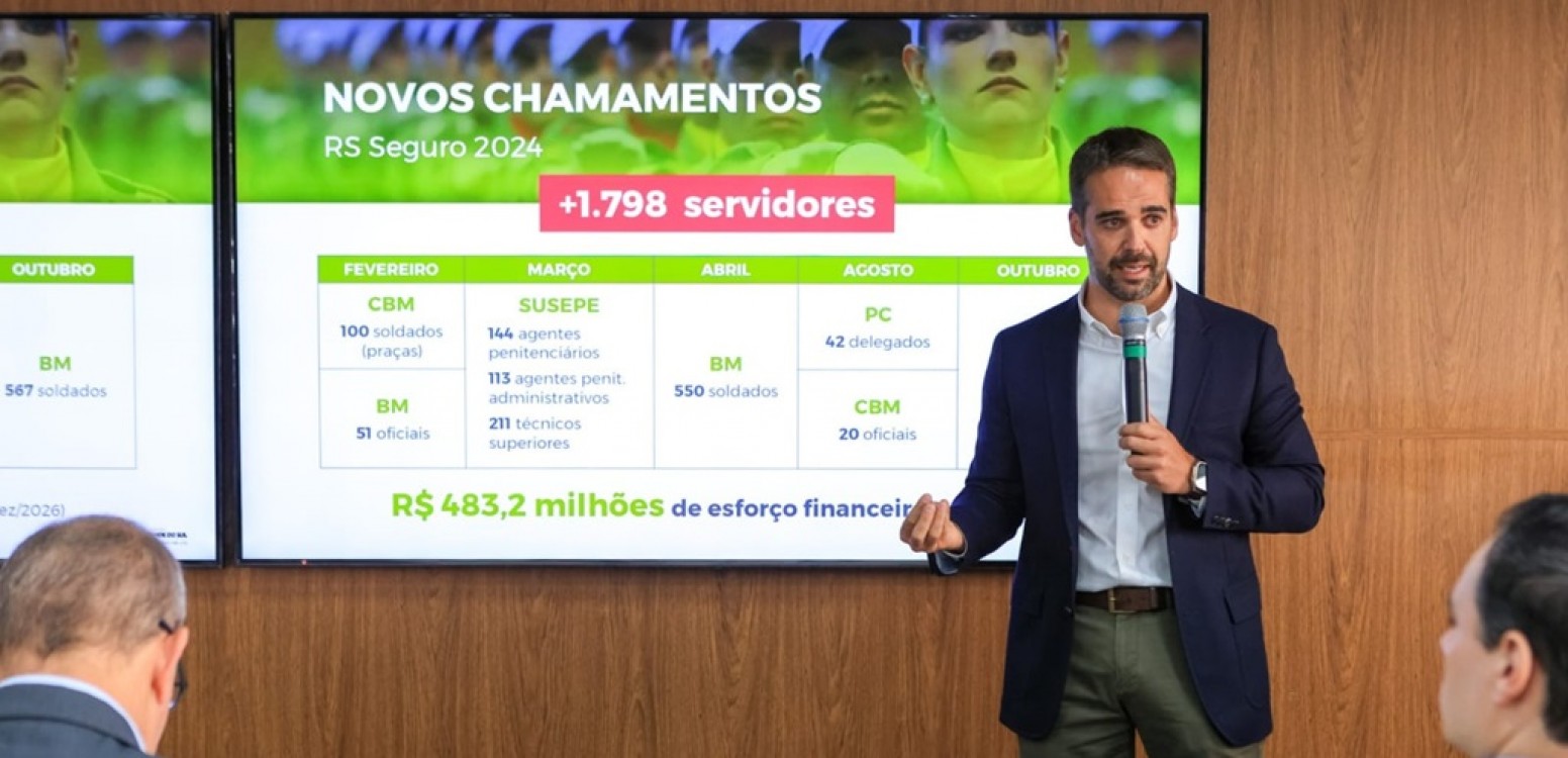 O governador Eduardo Leite anunciou, na tarde desta quarta-feira (28), o chamamento de 1.798 novos servidores para a Segurança Pública do Rio Grande do Sul, com investimento financeiro estimado em R$ 483,2 milhões até o fim de 2026. Serão incorporados servidores na Brigada Militar (BM), na Polícia Civil (PC), na Superintendência dos Serviços Penitenciários (Susepe) e no Corpo de Bombeiros Militar (CBMRS).