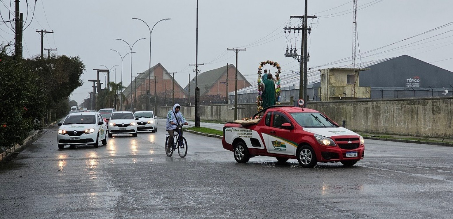 Enfeitada com flores, a imagem de São Cristóvão foi colocada em um veículo de apoio da Cooperativa dos Transportadores Autônomos Rodoviários de Cargas do Rio Grande (Cootracam), sendo seguida pelos motoristas. Em razão da chuva, houve baixa participação de ciclistas e motociclistas.