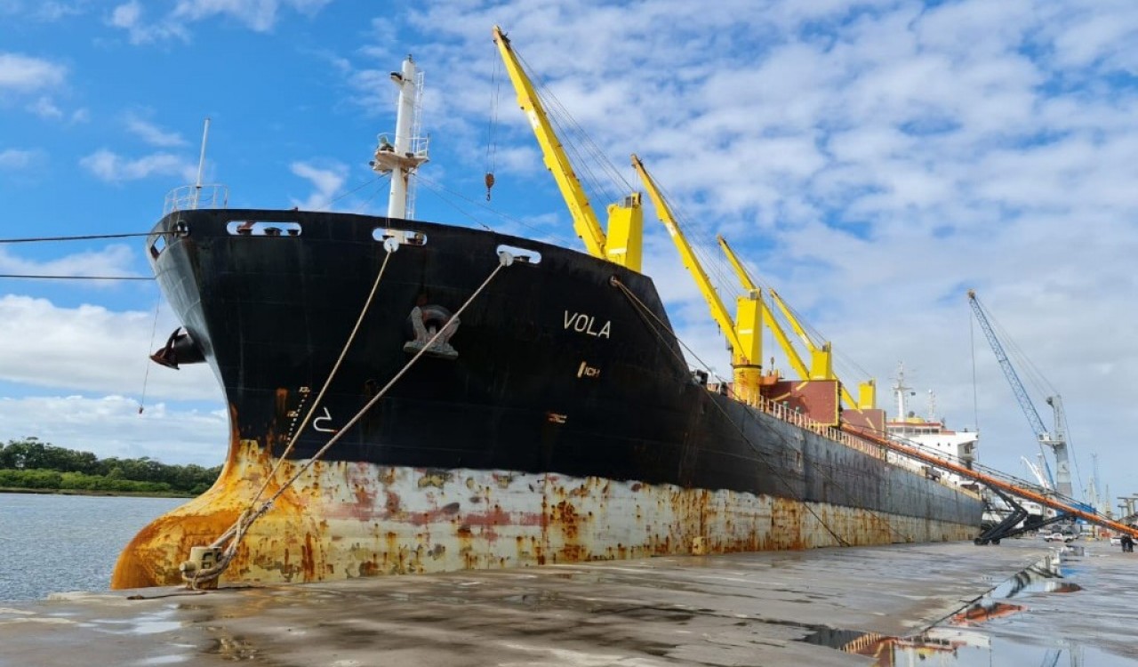 O navio MV Vola atracou no cais público na noite de sexta-feira (2), e a expectativa é de que a operação esteja concluída até a próxima terça-feira (6). A carga sai dos silos de armazenagem e segue por meio de esteiras até o porão da embarcação, em um processo que não utiliza guindastes e danifica menos o grão.