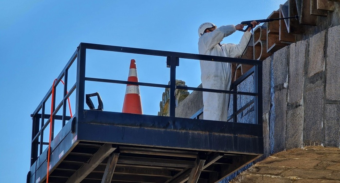 Teve início, na manhã deste sábado, a ação de limpeza e revitalização do pórtico de acesso à cidade. A estrutura de pedra, construída em 1950 em forma de máquina de costura, é um dos símbolos do município e remete a um dos momentos de sua história econômica, quando a indústria têxtil estava a pleno vapor.