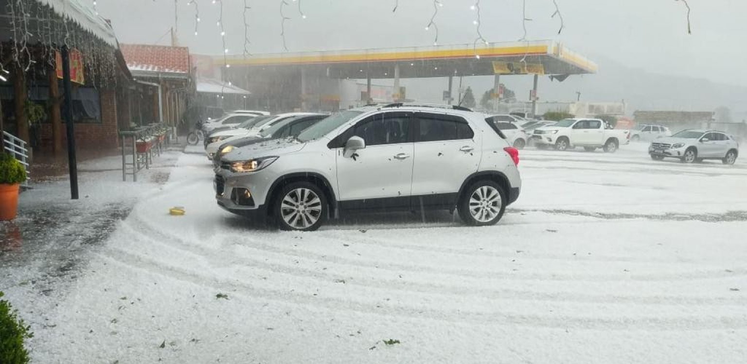 Os motoristas que trafegavam pelo local no momento da precipitação tentaram recolher seus automóveis para dentro de um posto de combustível e a área ficou branca de gelo. Foto: Divulgação/Metsul