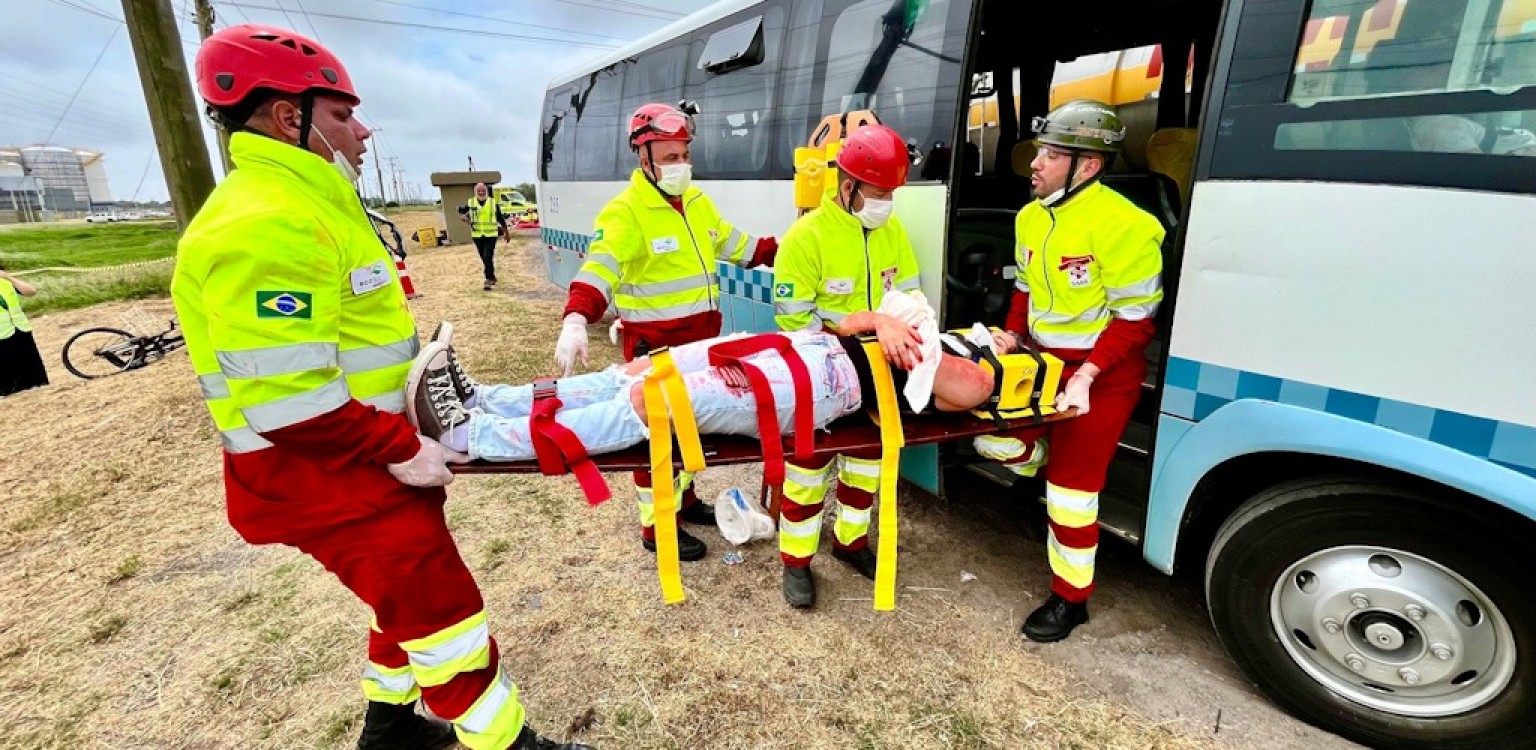 Na manhã deste domingo (03), uma simulação de acidente envolvendo múltiplas vítimas e vazamento de produto químico perigoso mobilizou uma grande equipe de resposta no Distrito Industrial de Rio Grande, ao longo do km 4 da BR 392. Organizada pela concessionária Ecosul, em parceria com as empresas Granel Química, Macra, Ambipar e Timac Agro, a simulação teve como objetivo testar a aplicação dos protocolos de emergência e a integração entre equipes de diferentes empresas e órgãos de segurança. A atividade contou também com a presença de observadores do Corpo de Bombeiros e de instituições integrantes do Plano de Auxílio Mútuo de Rio Grande (PAM-RG).