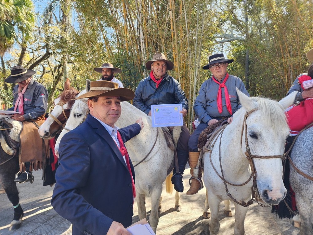 O coordenador da 6ª RT, Roberto Ferreira, aproveitou o momento para entregar os certificados de participação na Cavalgada Farroupilha aos cavalarianos que representaram a região na geração da Chama Crioula, em Canguçu, nos dias 12 e 13 de agosto. Durante sua fala, Ferreira fez um agradecimento a esses tradicionalistas.