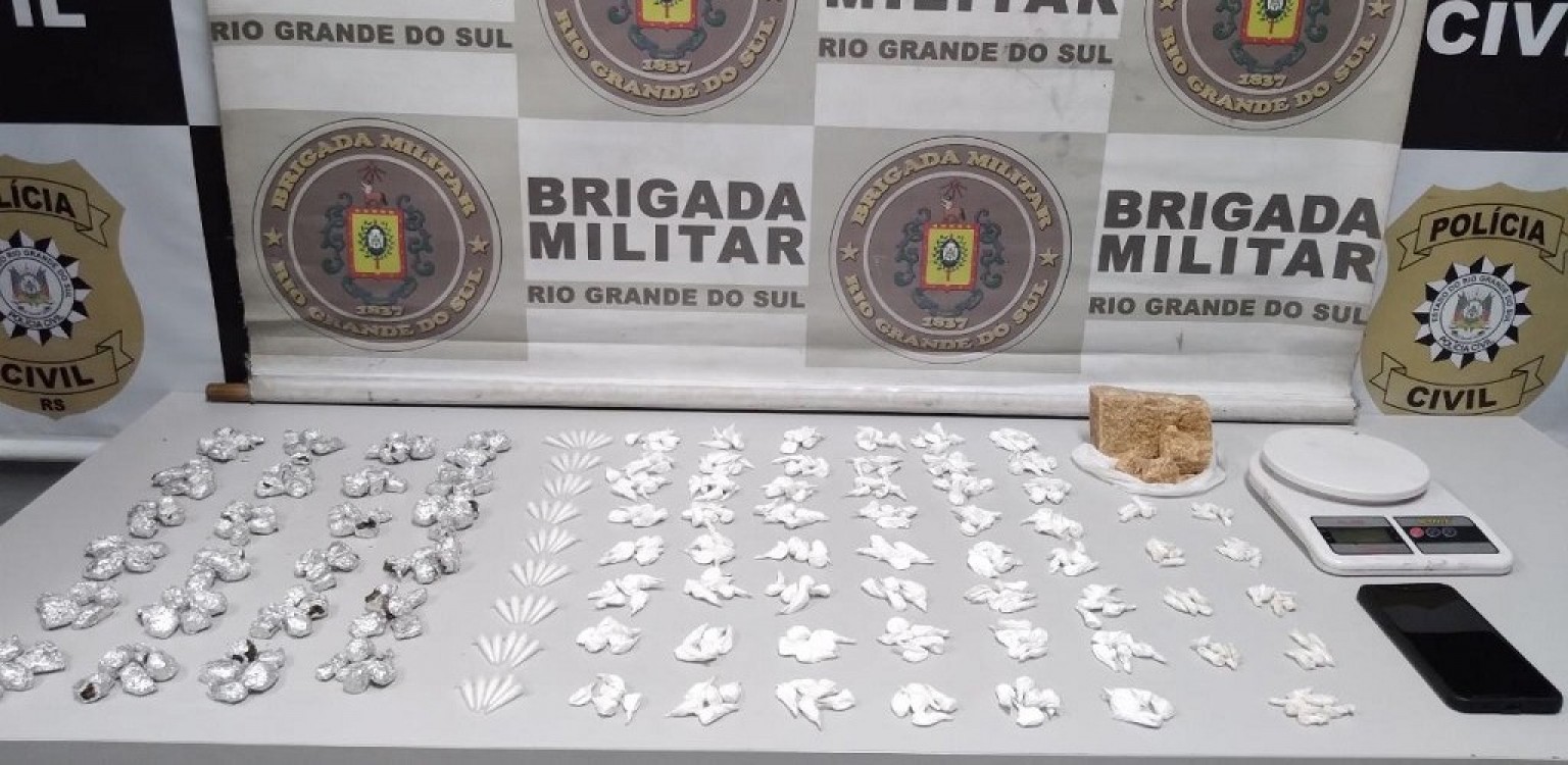 Durante a revista pessoal, foram localizadas com o jovem no interior da mochila as quantias de 379 gramas de crack, 137 gramas de cocaína, 210 gramas de maconha, uma balança de precisão e um telefone celular.
