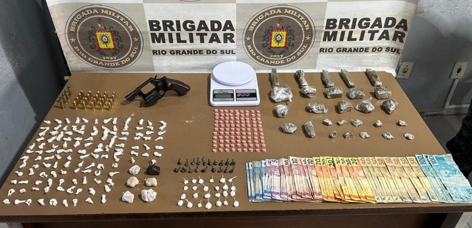 De acordo com as informações, a dupla foi abordada pelos brigadianos e durante a revista pessoal foram localizados um revólver e quatro munições de calibre 38, outras 20 de calibre 9mm, 405 gramas de maconha, 10,6 gramas de cocaína, 67,8 gramas de crack, 100 comprimidos de ecstasy, uma balança de precisão e a quantia de R$ 1.063 em dinheiro.