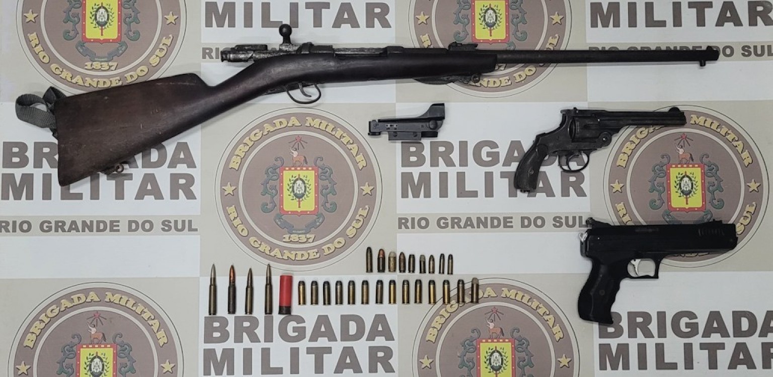 De acordo com as informações, os brigadianos localizaram com o homem um fuzil ferrolhado calibre 7.62, um revólver calibre 4, uma pistola de pressão, uma mira Reddot e outras 27 munições de diversos calibres.