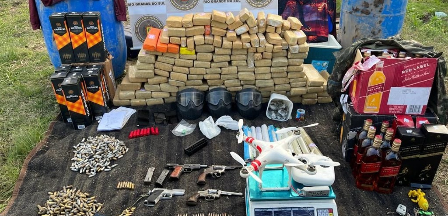 Foram localizados enterrados no chão 664 munições de diversos calibres, dois revólveres calibre 38 e duas pistolas 9mm. Também foram apreendidos na ocasião 128 quilos de maconha, 320 gramas de cocaína, 520 gramas de skunk, três smartphones, um drone, 49 garrafas de whisky, entre outros materiais.