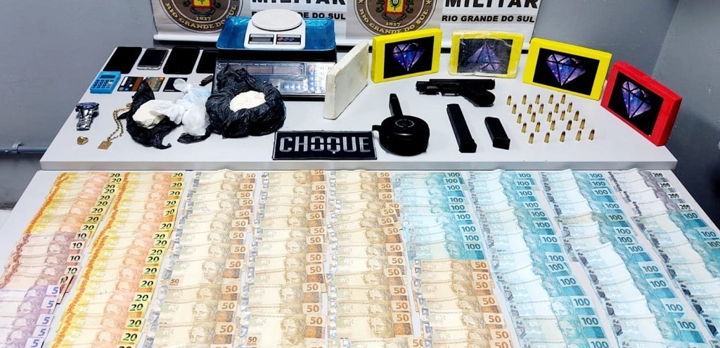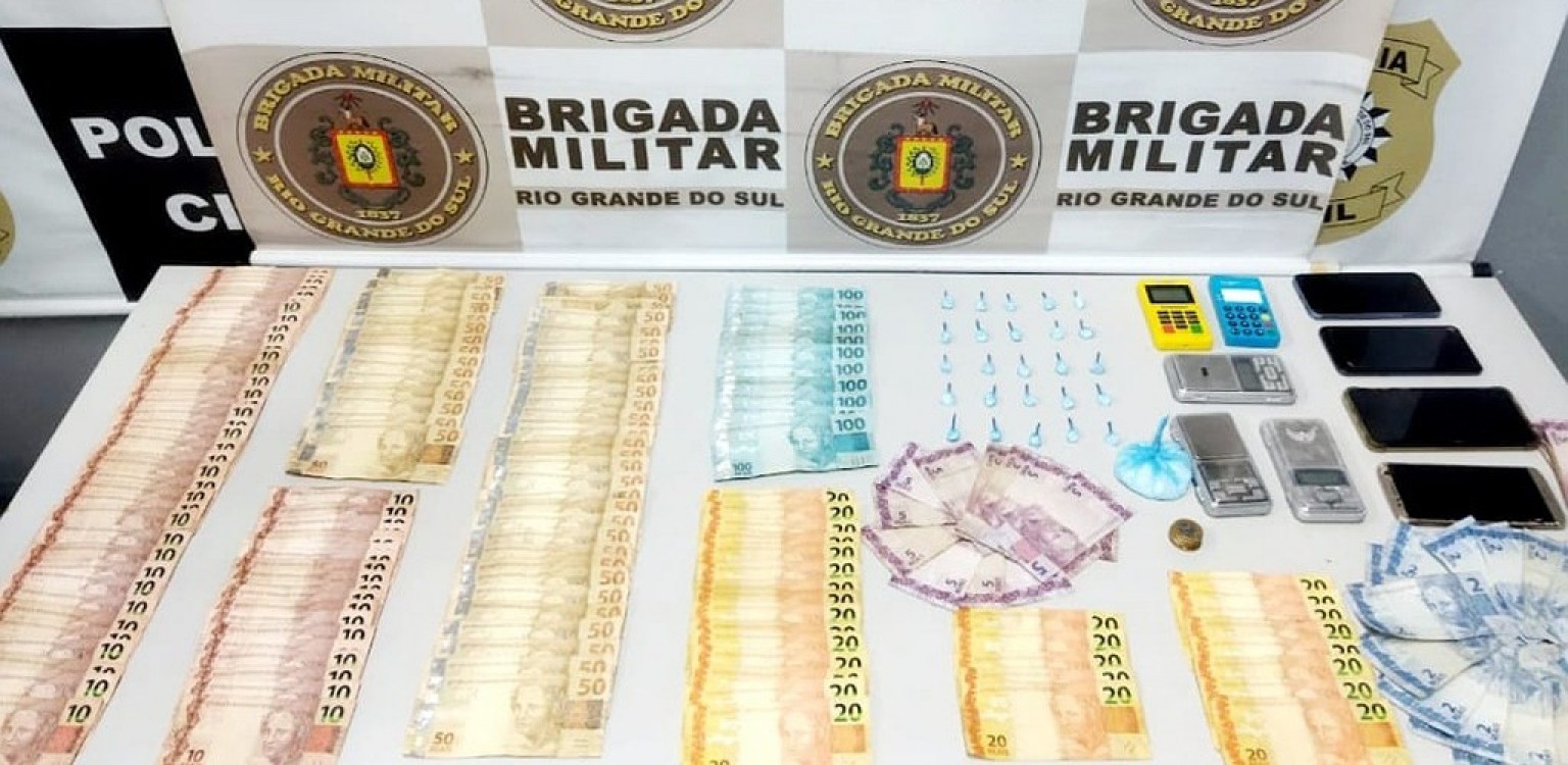 No primeiro caso, os brigadianos desconfiaram de um homem que mudou de atitudes ao perceber a aproximação da viatura e resolveram fazer a abordagem. Durante a revista pessoal foram encontradas uma porção grande de maconha, 25 porções de cocaína, três balanças de precisão, quatro celulares, um caderno, duas máquinas de cartão e a quantia de R$ 4.849.