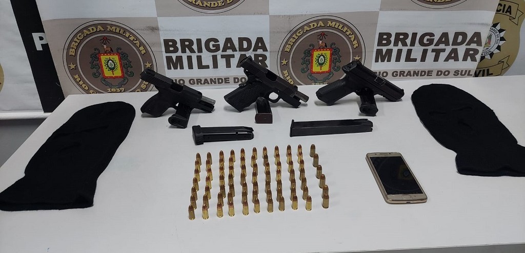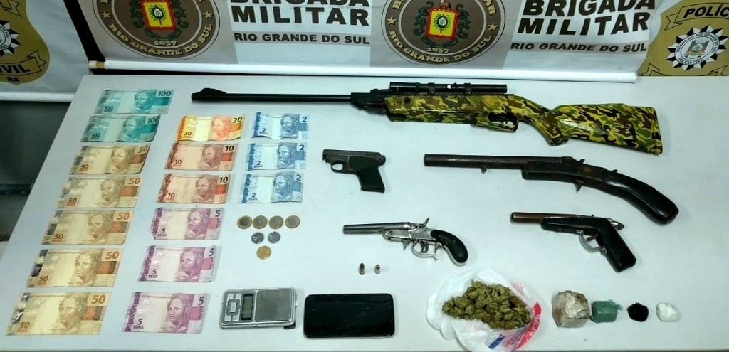 Com eles foram apreendidas uma pistola calibre 9mm, um carregador 9mm, 39 munições do mesmo calibre, duas munições calibre 32, três balanças de precisão, cinco celulares, cinco quilos de maconha, uma sacola com a mesma substância, 28 porções de cocaína, outras 15 de crack, um comprimido de ecstasy, uma faca, uma câmera de monitoramento, um saco de eppendorfs, dois rádios comunicadores e a quantia de R$ 1226 em dinheiro.