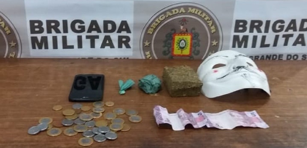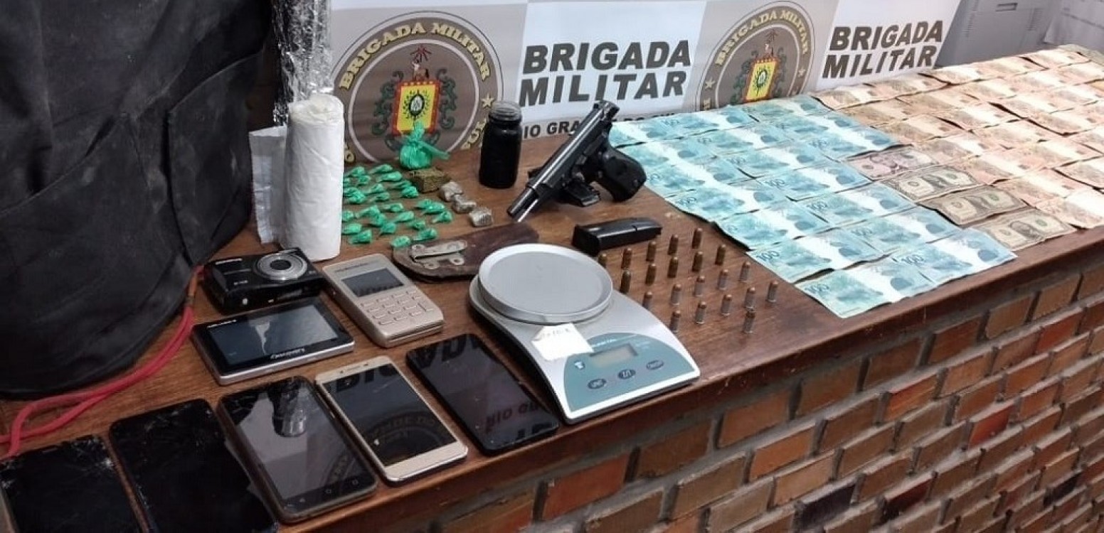 Com o trio, os policiais localizaram quatro tijolos de maconha, 31 buchas de cocaína, uma pistola calibre 380, dois carregadores, cinco telefones celulares, uma balança de precisão, uma câmera fotográfica, uma máquina de cartão, um aparelho de GPS, material para embalar drogas e a quantia de R$ 3.317,90 em dinheiro. Os homens receberam voz de prisão em flagrante e foram apresentados na delegacia da Polícia Civil do município.