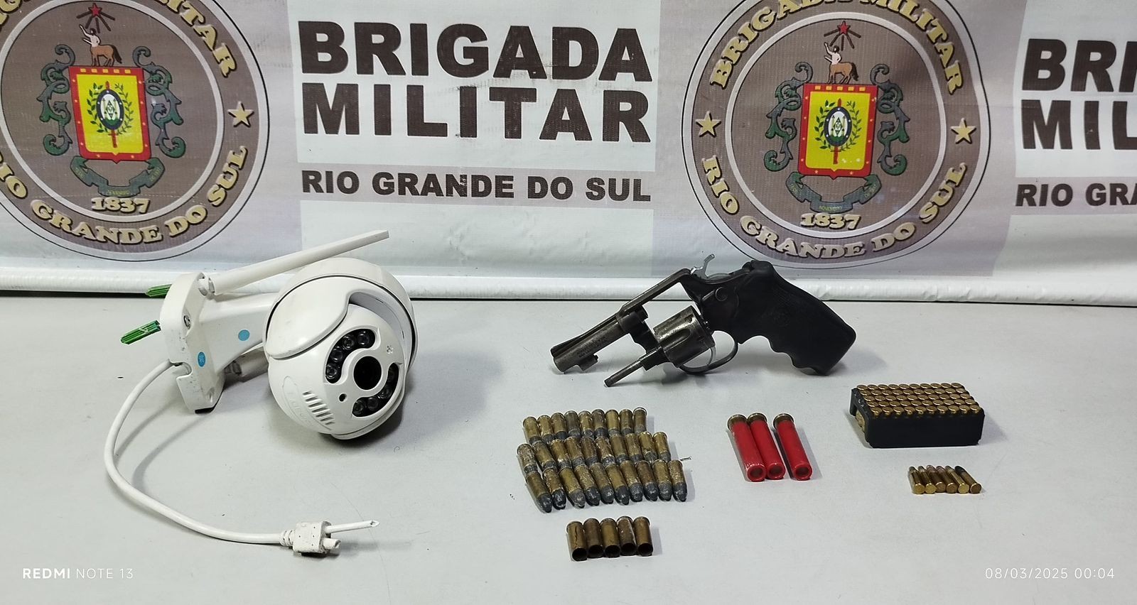 Na primeira situação, na noite desta sexta-feira (7), na Vila da Quinta, os brigadianos abordaram um homem e com ele foram localizados um revólver calibre 32, munições de diversos calibres, cinco estojos de calibre 32 deflagrados e uma câmera de monitoramento.