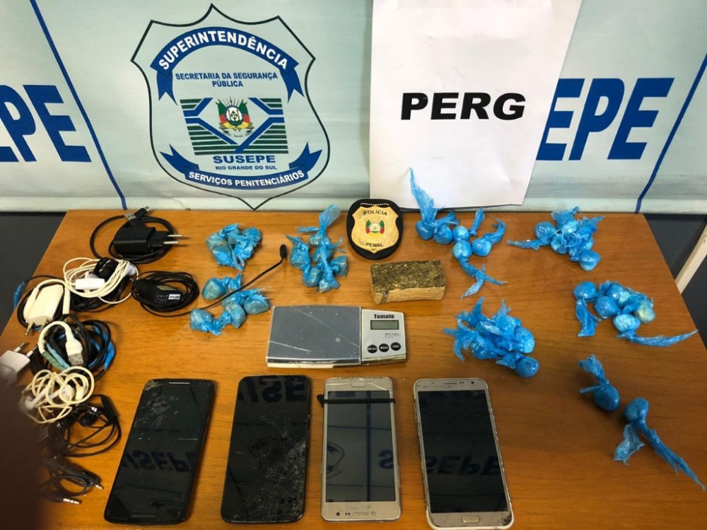 Na oportunidade, foram apreendidos pelos agentes penitenciários da Susepe quatro telefobes celulares, 80 gramas de maconha, 21 invólucros de cocaína, outros 17 de crack e uma balança de pecisão.