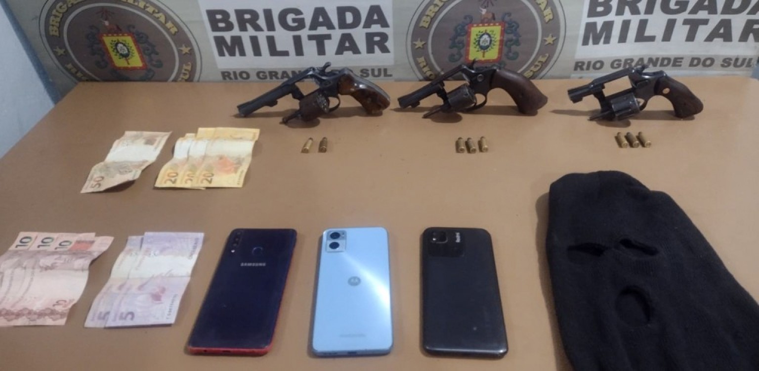Com os criminosos presos foram apreendidos três revólveres, oito munições intactas, três telefones celulares, uma touca ninja e o dinheiro subtraído do posto de combustíveis. Foto: Divulgação/4º BPM