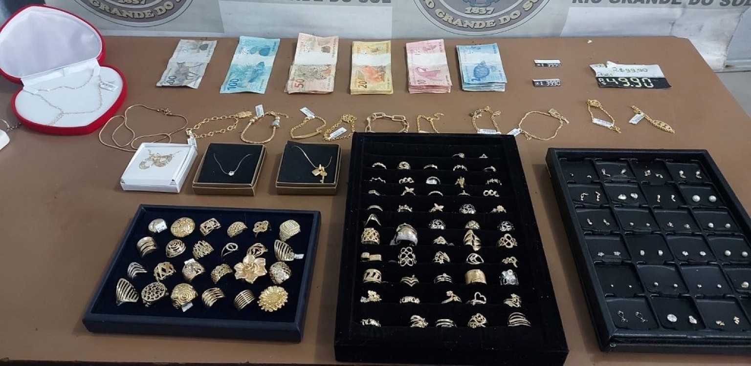 Minutos depois de deixarem o estabelecimento, o casal foi localizado pelos brigadianos. Com eles estavam o dinheiro levado da joalheria e os acessórios. Foram apreendidos a quantia de R$ 824 em dinheiro, 76 anéis, dez pulseiras, cinco colares, uma mochila e sete caixas para guardar joias.