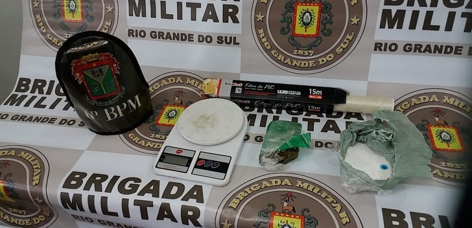 A equipe recebeu uma informação e foi até o local para constatar a denúncia. Ao chegar no ponto indicado, os brigadianos encontraram a bolsa com uma porção de cocaína, um tablete de maconha, uma balança de precisão e um rolo de filme de PVC.