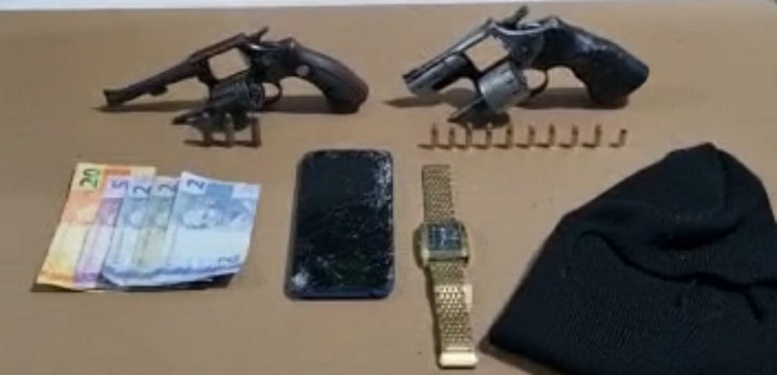 Com eles os brigadianos localizaram e apreenderam um revólver calibre 22 e outro de calibre 38, munições, um telefone celular, um relógio, uma touca ninja e uma quantia em dinheiro, cujo valor não foi revelado. Os homens foram apresentados na Delegacia de Polícia de Pronto Atendimento (DPPA) para o registro da ocorrência. Nenhum policial ficou ferido na ação.