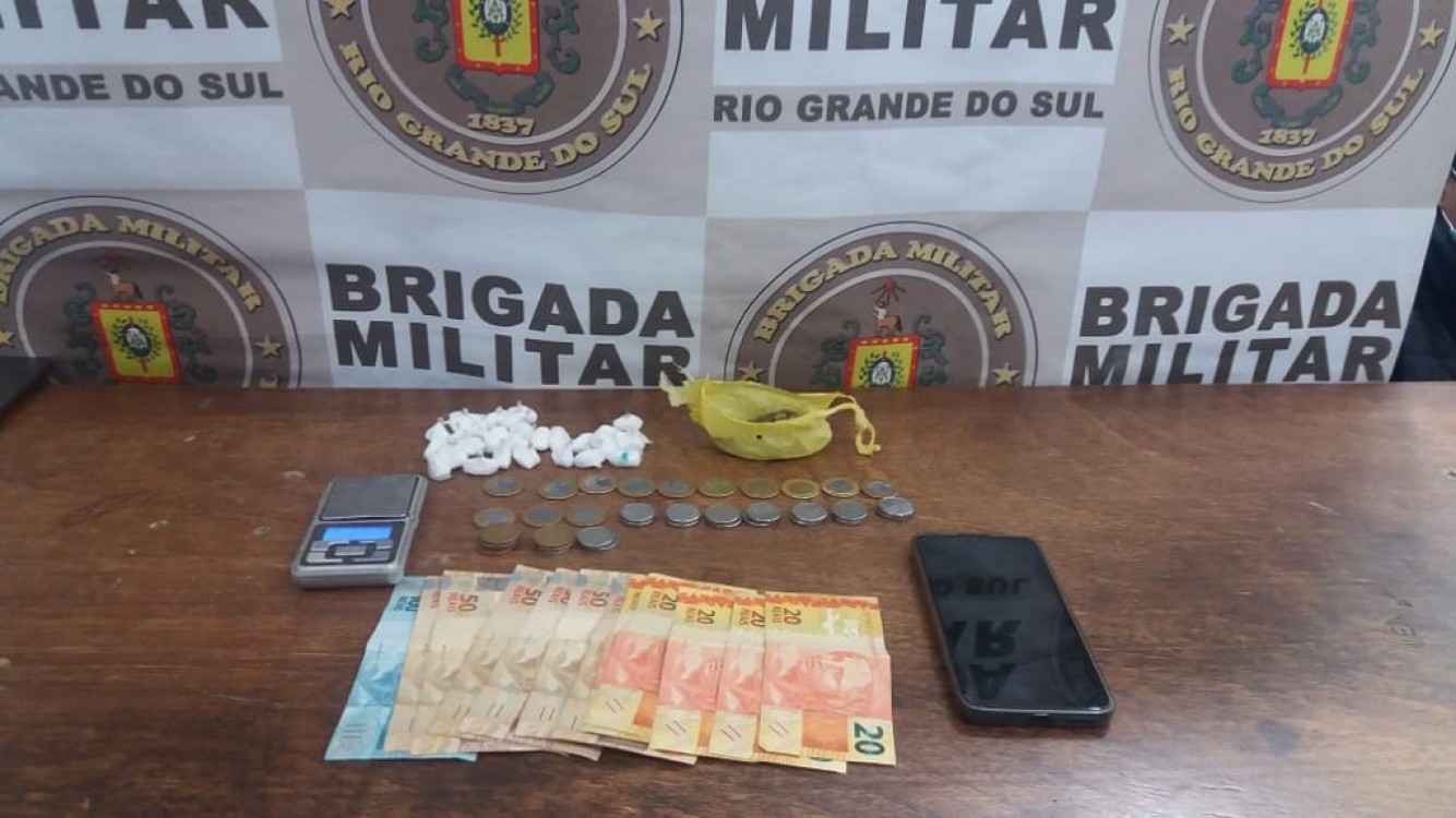Na revista pessoal, os PMs localizaram 30 porções de cocaína, duas porções de maconha, um aparelho celular, uma balança e a quantia de R$ 523,00 em dinheiro.