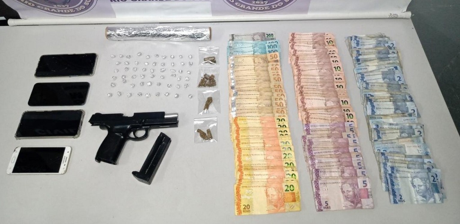 O homem foi encontrado pelos policiais e com ele uma pistola 9 mm, carregada com 16 munições intactas. Já no Cassino, uma guarnição do 5º BPChq prendeu um casal por tráfico. Com eles, os policiais apreenderam 55 pedras de crack, quatro invólucros de maconha, uma pistola de pressão, quatro celulares e a quantia de R$ 2.953 em dinheiro.