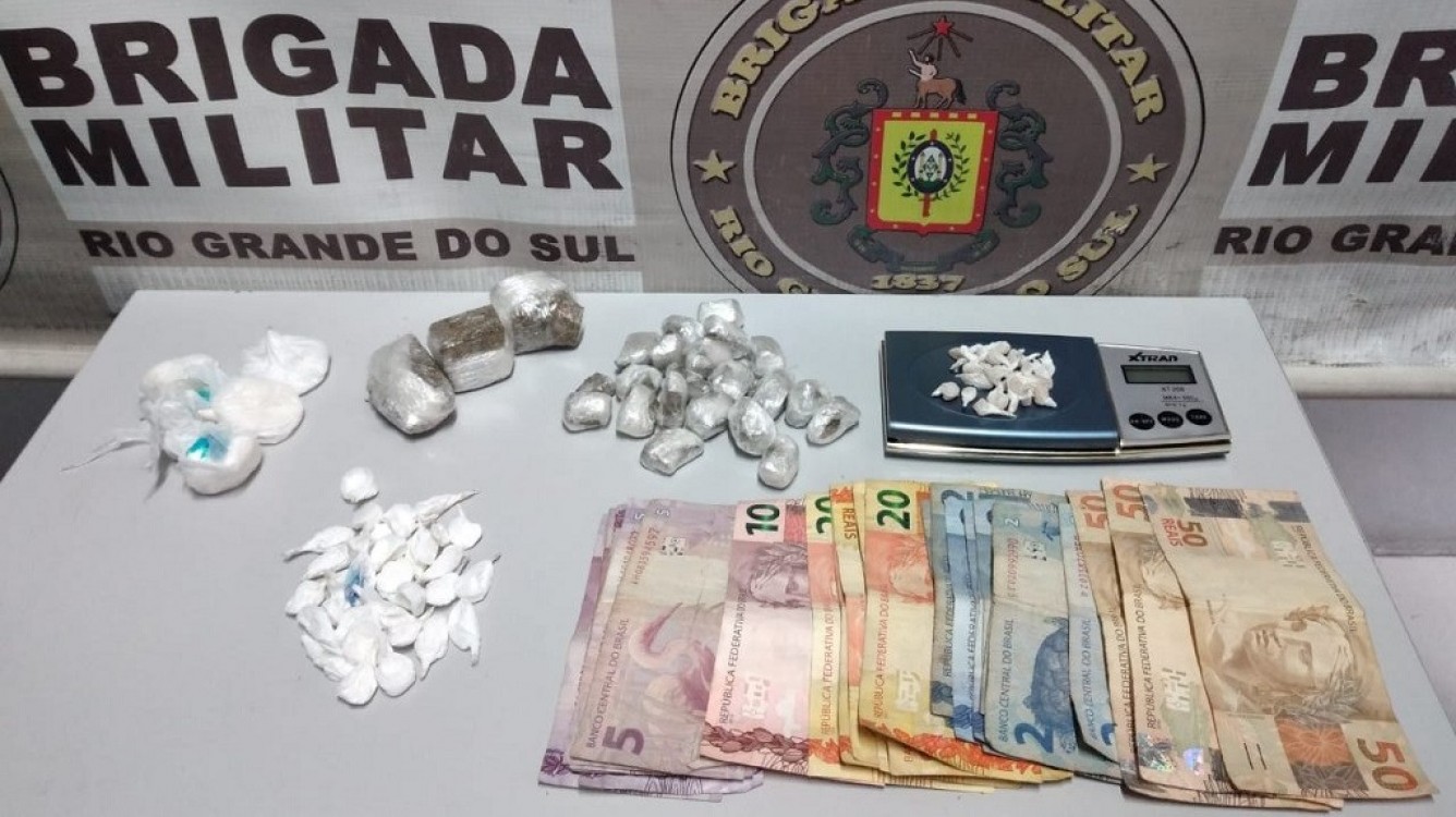 De acordo com as informações, os brigadianos desconfiaram de suas atitudes ao perceber a aproximação da viatura e realizaram a abordagem. Com ele, foram localizadas 36 porções de cocaína, 22 pedras de crack, 24 tabletes de maconha, uma balança de precisão e a quantia de R$ 355 em dinheiro.