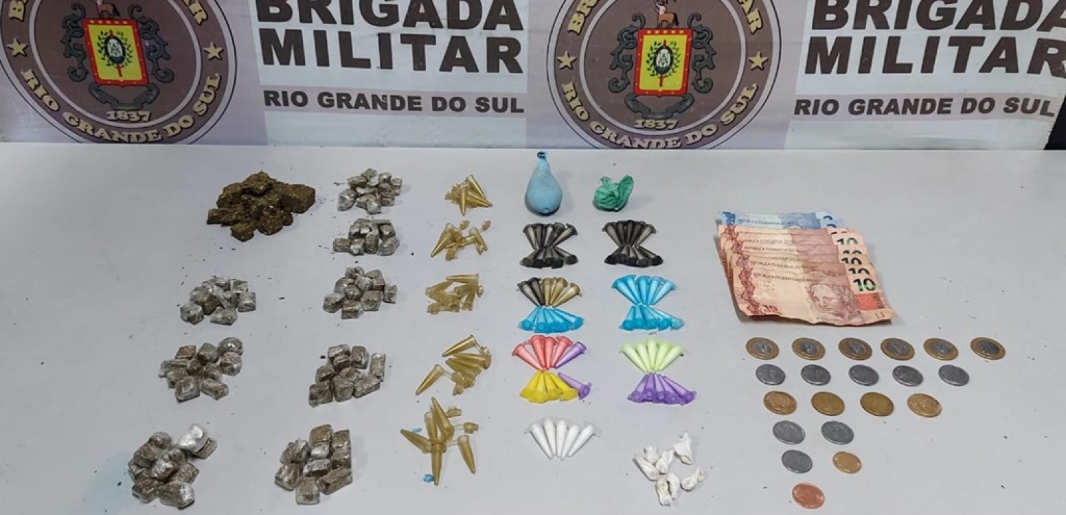 Durante a revista pessoal, os brigadianos localizaram com eles 85 porções de maconha, 67 porções de cocaína, sete porções de crack, 25 eppendorfs vazios e uma quantia em dinheiro, cujo total não foi informado.
