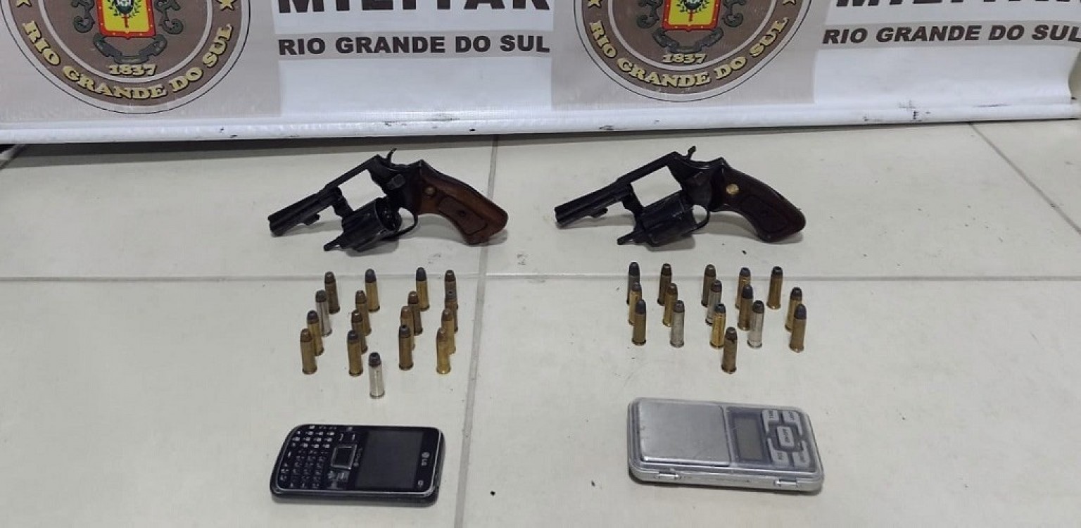 Com as características de ambos, os policiais passaram a realizar buscas até o momento em que localizaram os dois em frente à residência. Durante a revista pessoal, os brigadianos encontraram com eles dois revólveres calibre 38, 33 munições, uma balança de precisão e um telefone celular.