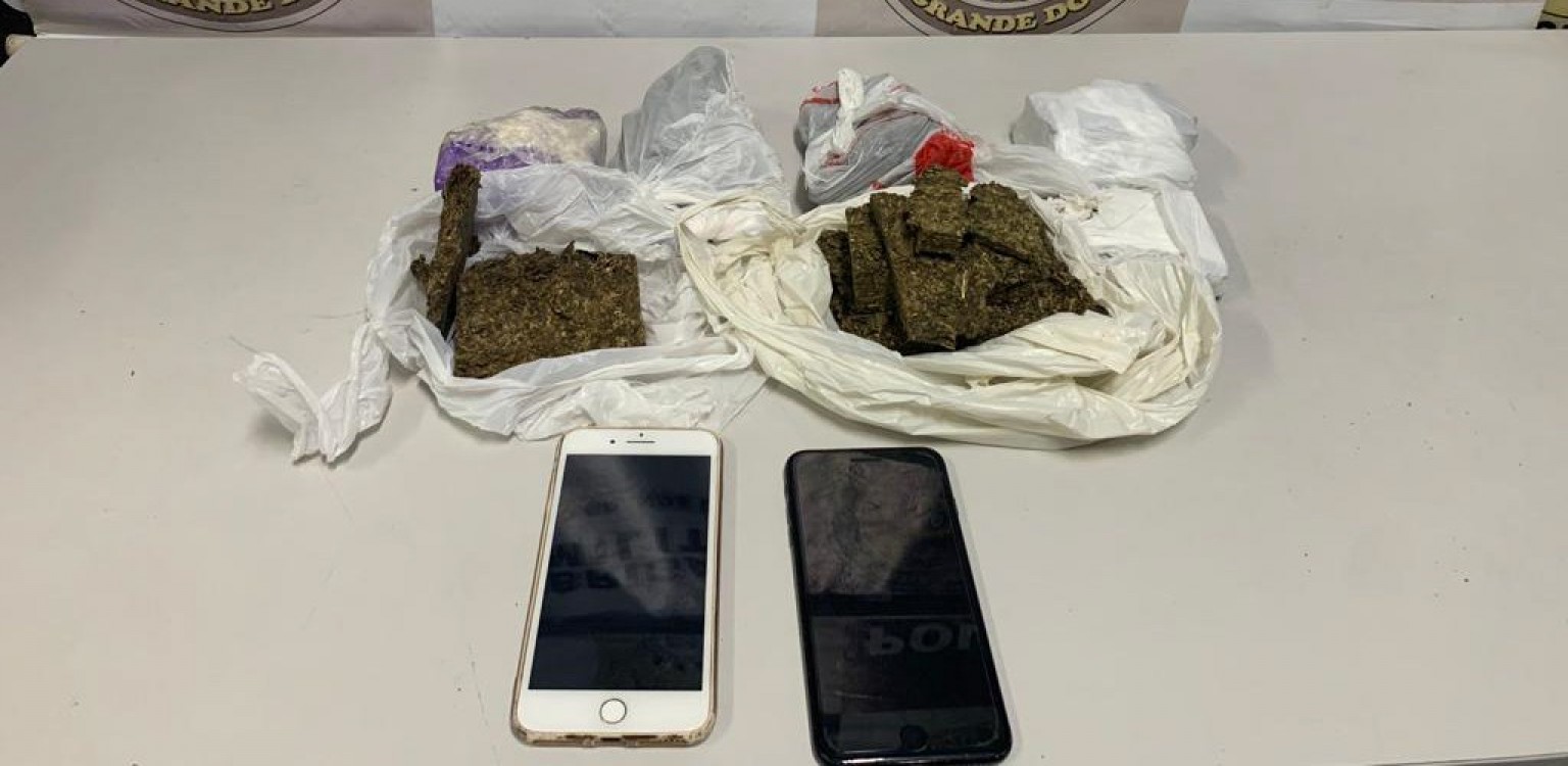 Durante a revista pessoal, os brigadianos localizaram uma quantia de entorpecentes que não teve o peso informado e dois telefones celulares. Foto: Divulgação/BM