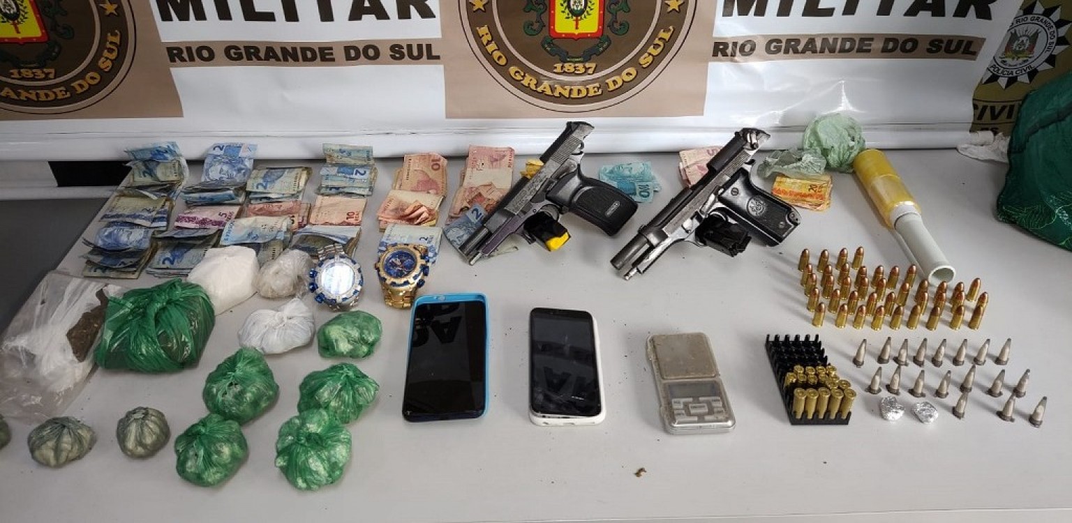 Além disso, foram apreendidas seis porções de maconha, três sacos com porções de crack, duas porções grandes de maconha, uma fração de cocaína, uma pedra grande de crack, um rolo de filme PVC, dois carregadores de 9 mm, uma balança de precisão, 33 pedras de crack, 19 pinos de cocaína e a quantia de R$ 736 em dinheiro.