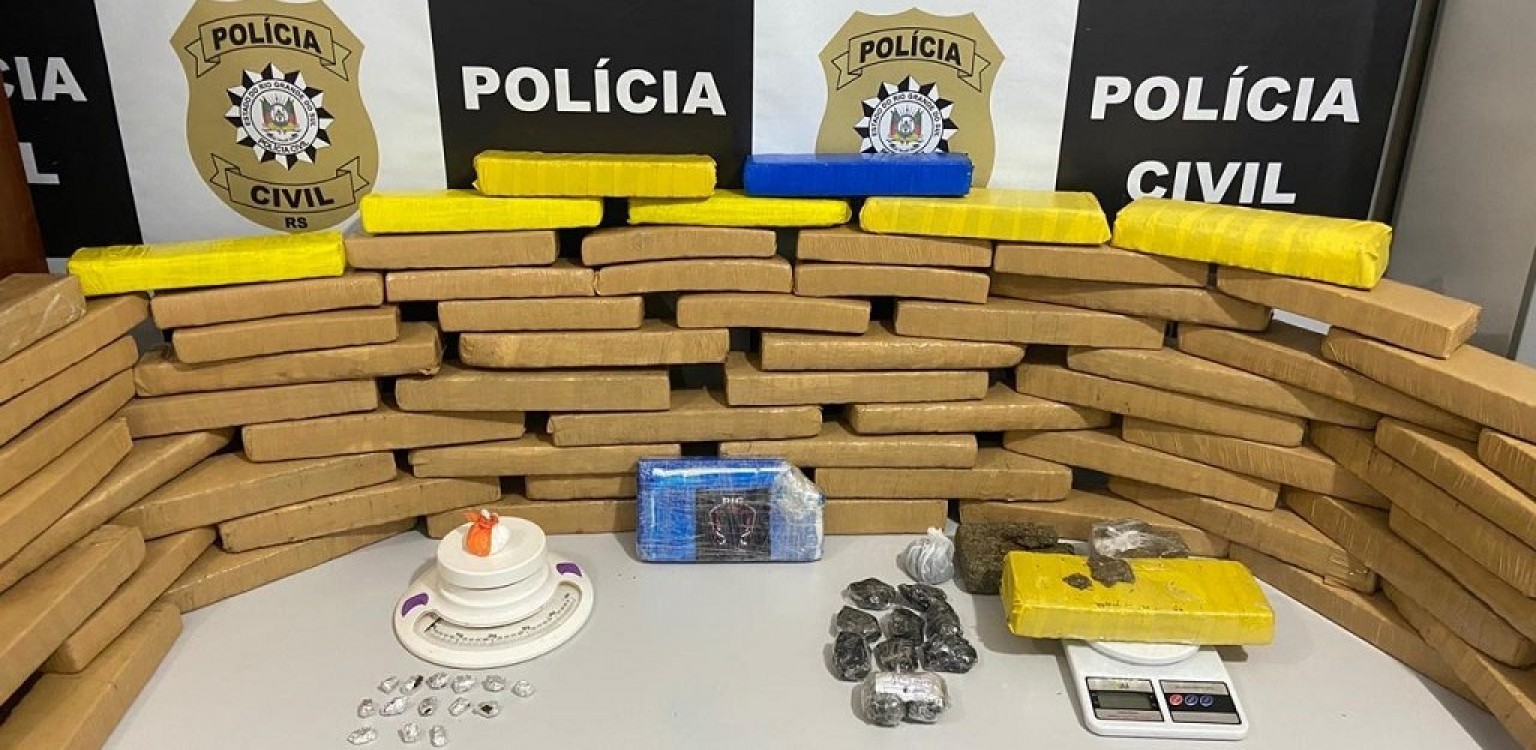 Com a dupla, foram apreendidos 53 kg de maconha, um quilo de cocaína, uma balança de precisão e uma motocicleta. Foto: Divulgação/PC