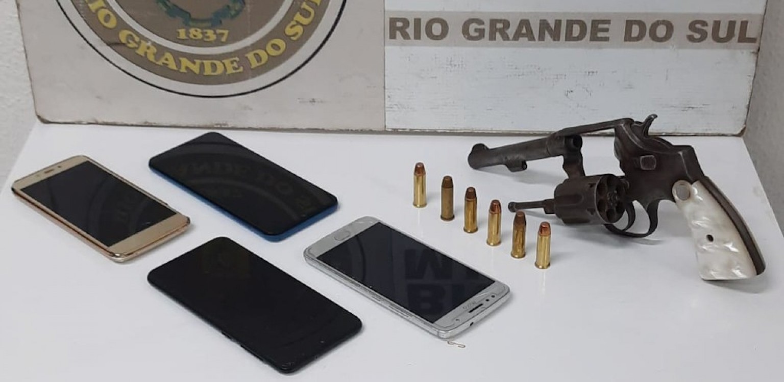 Os policiais apreenderam quatro celulares e com um deles foi localizado um revólver calibre 38, carregado com seis munições intactas. O mesmo flagrado com portando a arma também possuía em seu desfavor um mandado de prisão. Ele recebeu voz de prisão e foi encaminhado à Delegacia de Polícia (DP) do Cassino para apresentação à autoridade policial.
