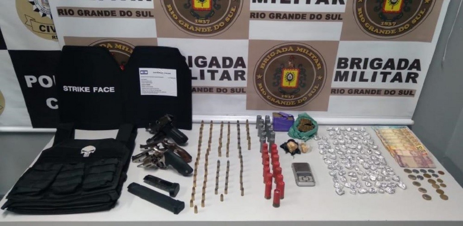 O suspeito ainda tentou fugir ao receber ordem de parada, mas foi detido pelos brigadianos. Durante a revista pessoal, os policiais localizaram com ele uma pistola calibre 380, um revólver calibre 38, outro de calibre 32, um colete balístico, um carregador de pistola, uma balança de precisão, maconha, uma bucha de cocaína, duas pedras de crack, 27 munições de calibre 12, seis munições de calibre 38, 15 munições de calibre 32, 35 munições de calibre 9mm, 29 munições de calibre 380 e a quantia de R$ 1.372,95 em dinheiro.