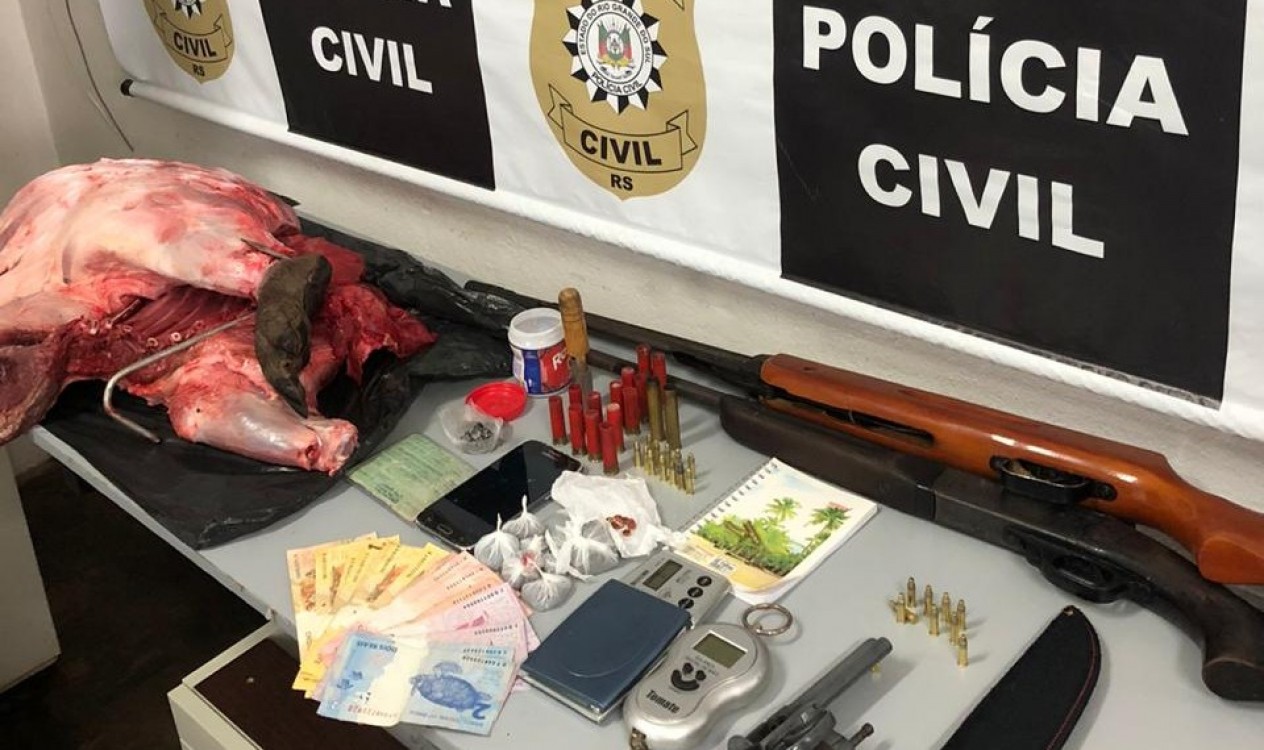 Na ação, os policiais localizaram com ele um espingarda calibre 35, um revólver calibre 22, uma arma de pressão adaptada para calibre 22, 32 munições de calibre 35, 14 munições de calibre 22, 32 gramas de maconha, uma balança de precisão, quantidades de espoleta, pólvora e chumbo, além de carne de capivara.