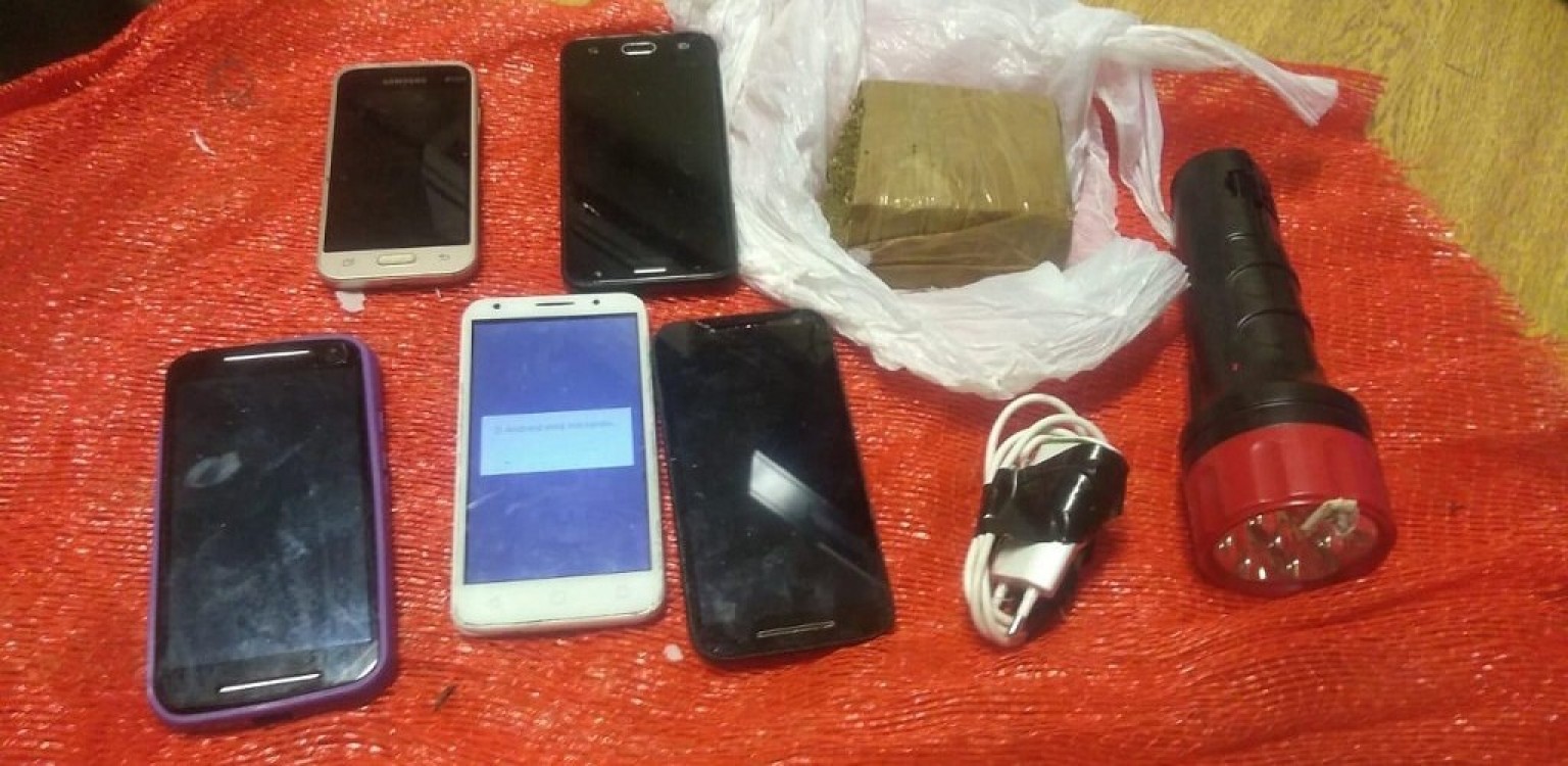 No interior da embalagem estavam cinco telefones celulares, um carregador e um tijolo de maconha. Foto: Divulgação/Susepe