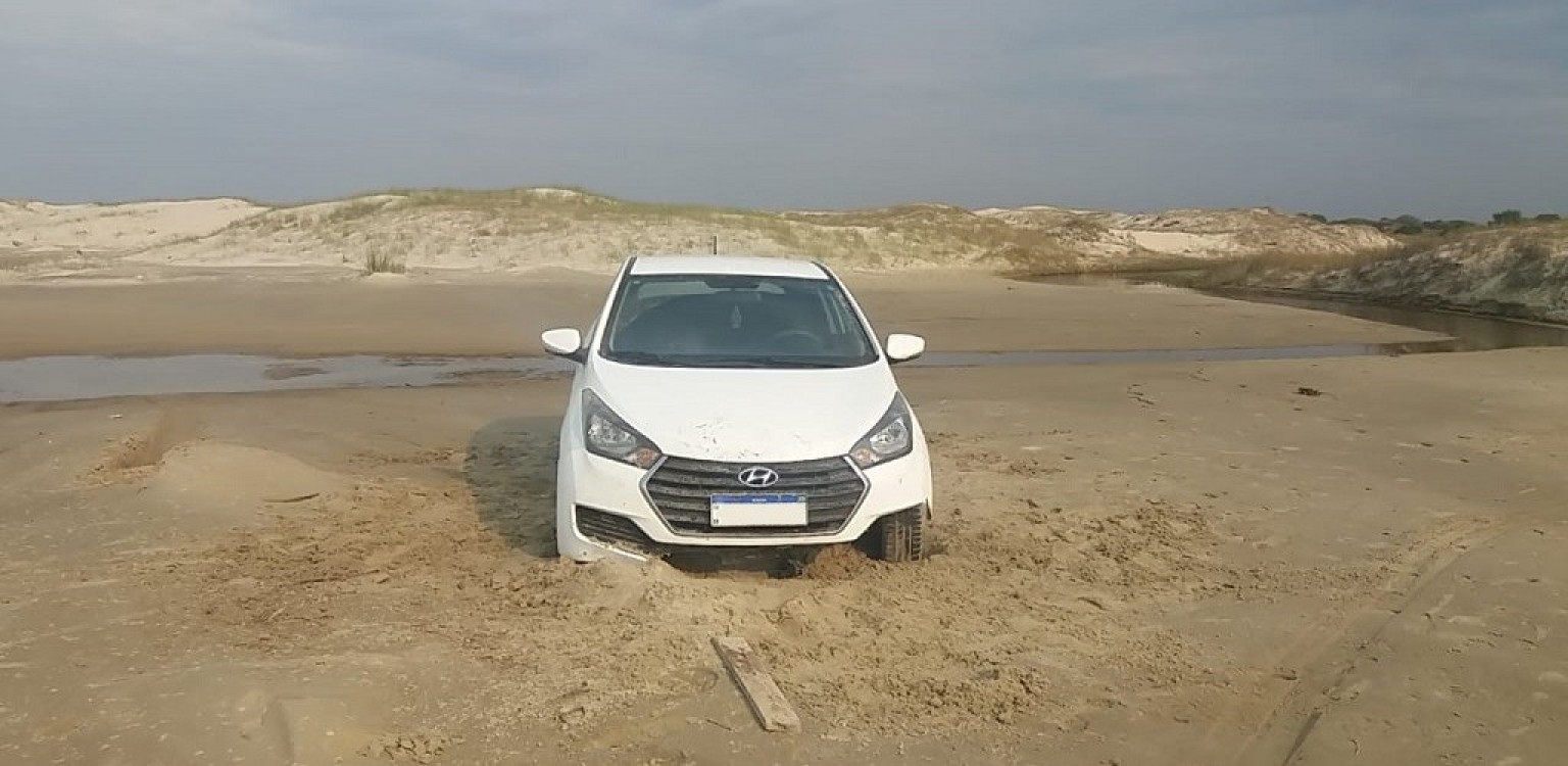 Na manhã de domingo, o 190 recebeu uma denúncia dando conta de um carro abandonado na beira da praia e a aproximadamente um quilômetro do navio Altair, em direção a Santa Vitória do Palmar. Foto: Divulgação/Redes sociais